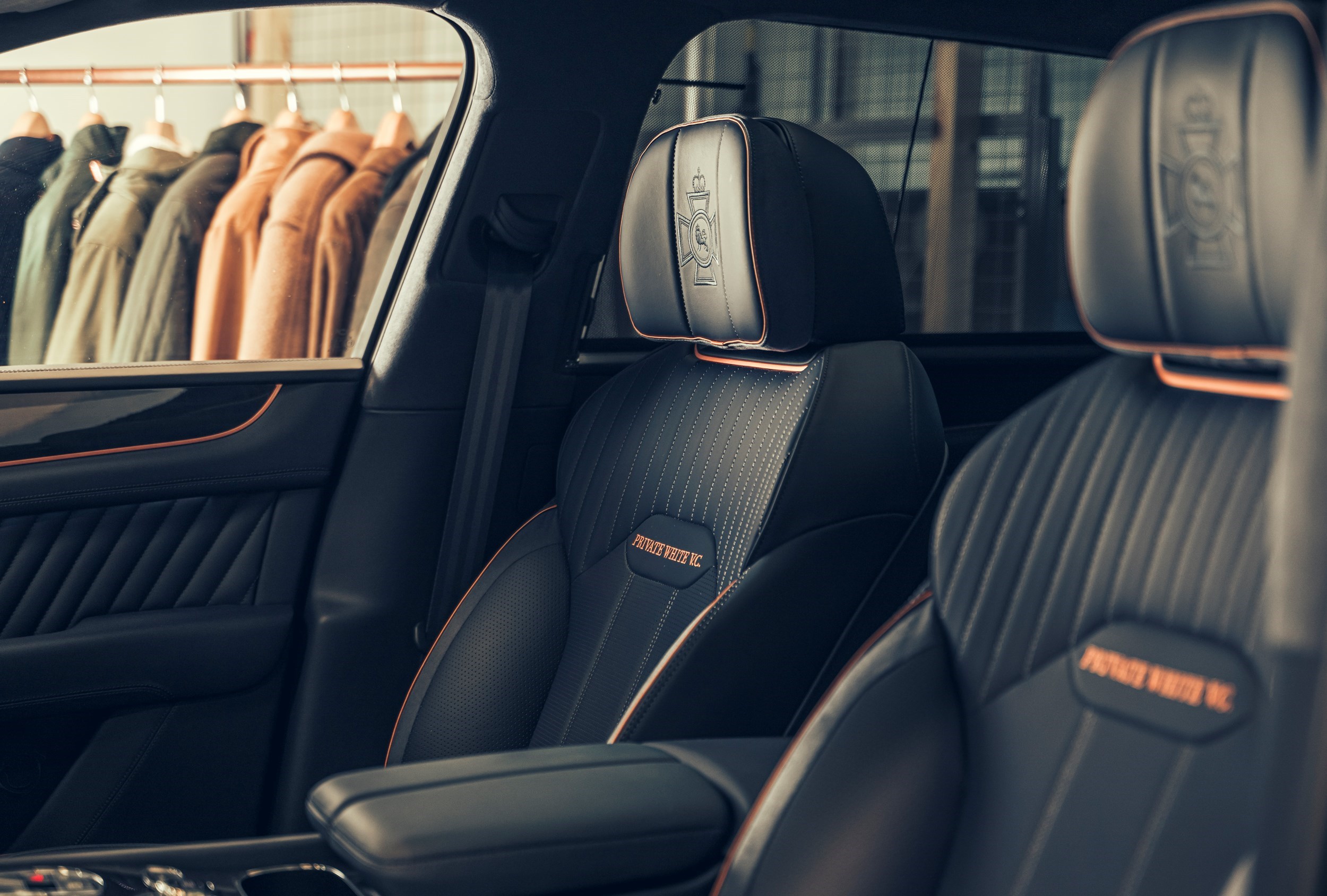Taking inspiration from the courage of Private White and today’s clothing line, the specially commissioned Bentayga Azure uses multiple copper detailing throughout the cabin including seat piping, embroidery and bespoke features, representing the copper telephone line.
