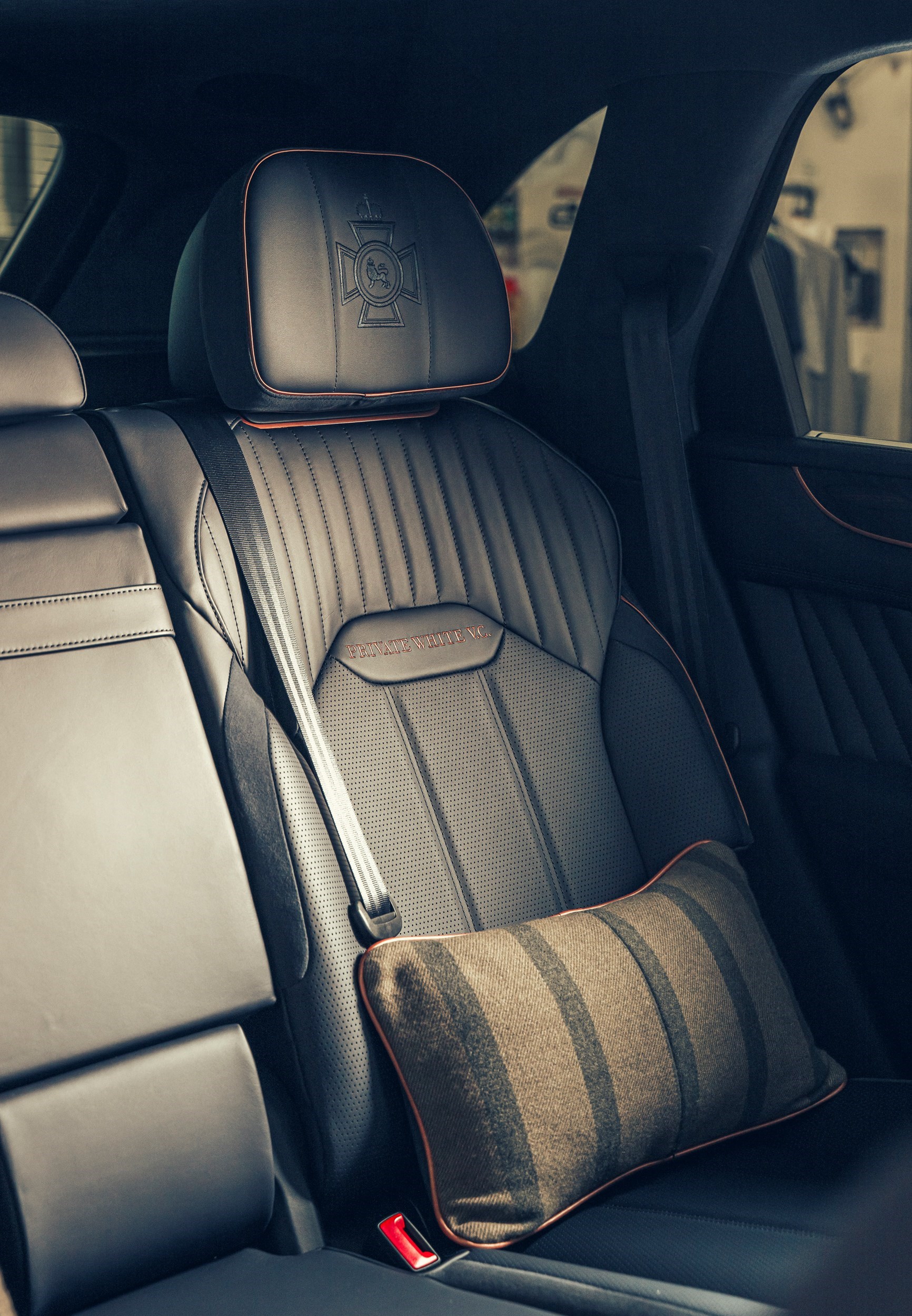 Additionally, to the seats and door interiors, clean purposeful sewing lines reflect the style and functionality of military inspired clothing. Bespoke embroidery including the Victoria Cross emblem to the headrests and Private White V.C. lettering finish the cabin details off perfectly. Loose cushions to the rear have been crafted from a Lancashire-woven cashmere cloth commissioned exclusively to commemorate Jack White’s regimental blanket stripe.