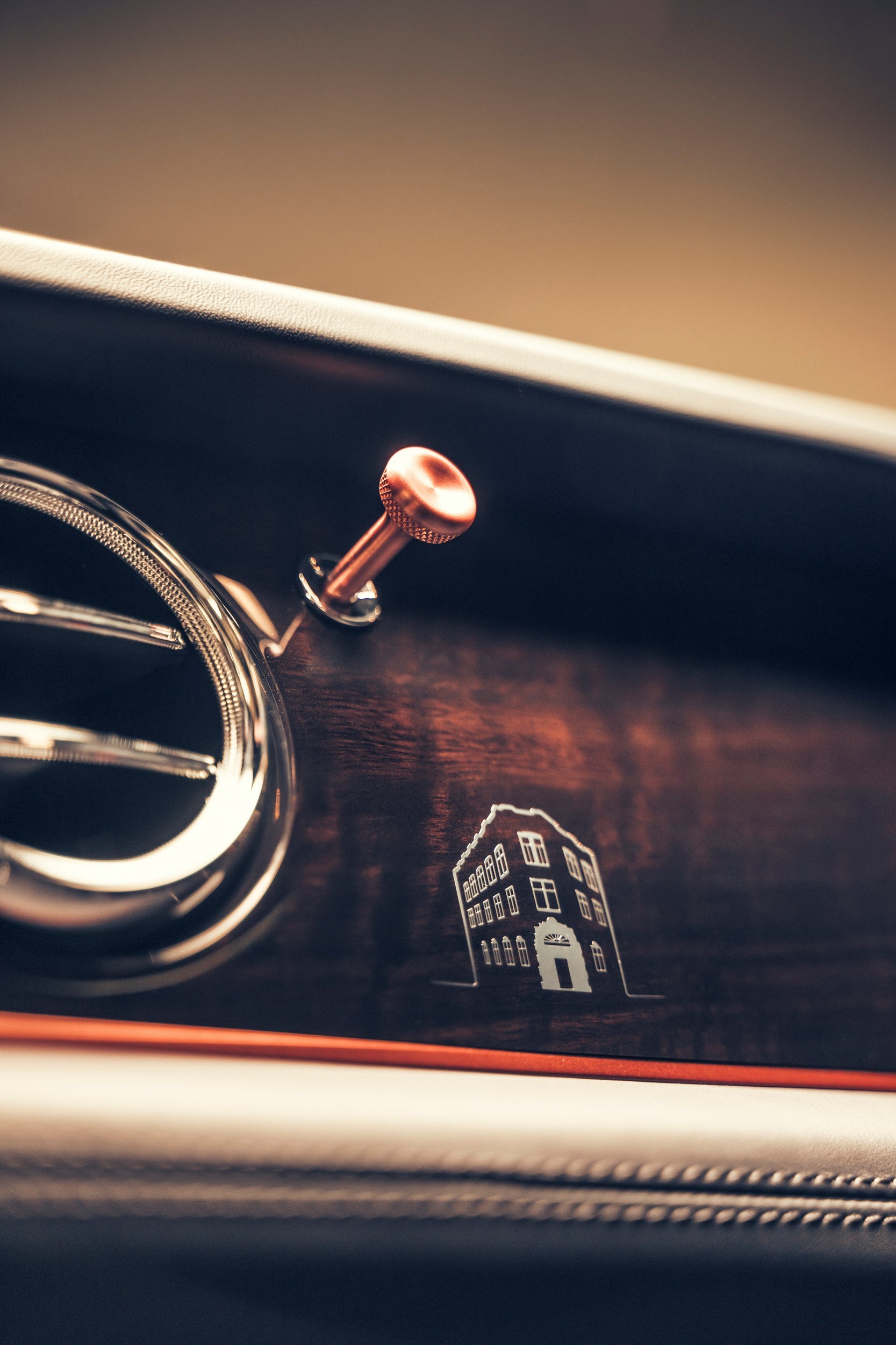 The dashboard includes organ stops finished in anodised copper and a silhouette of ‘Cottenham House’, the Private White V.C. factory built in 1853, to the passenger fascia. As a hidden delight not only are there bespoke treadplates, but in the door pockets a subtle embroidered bulldog can be found representing the company’s unofficial mascot who can often be seen at the factory today.