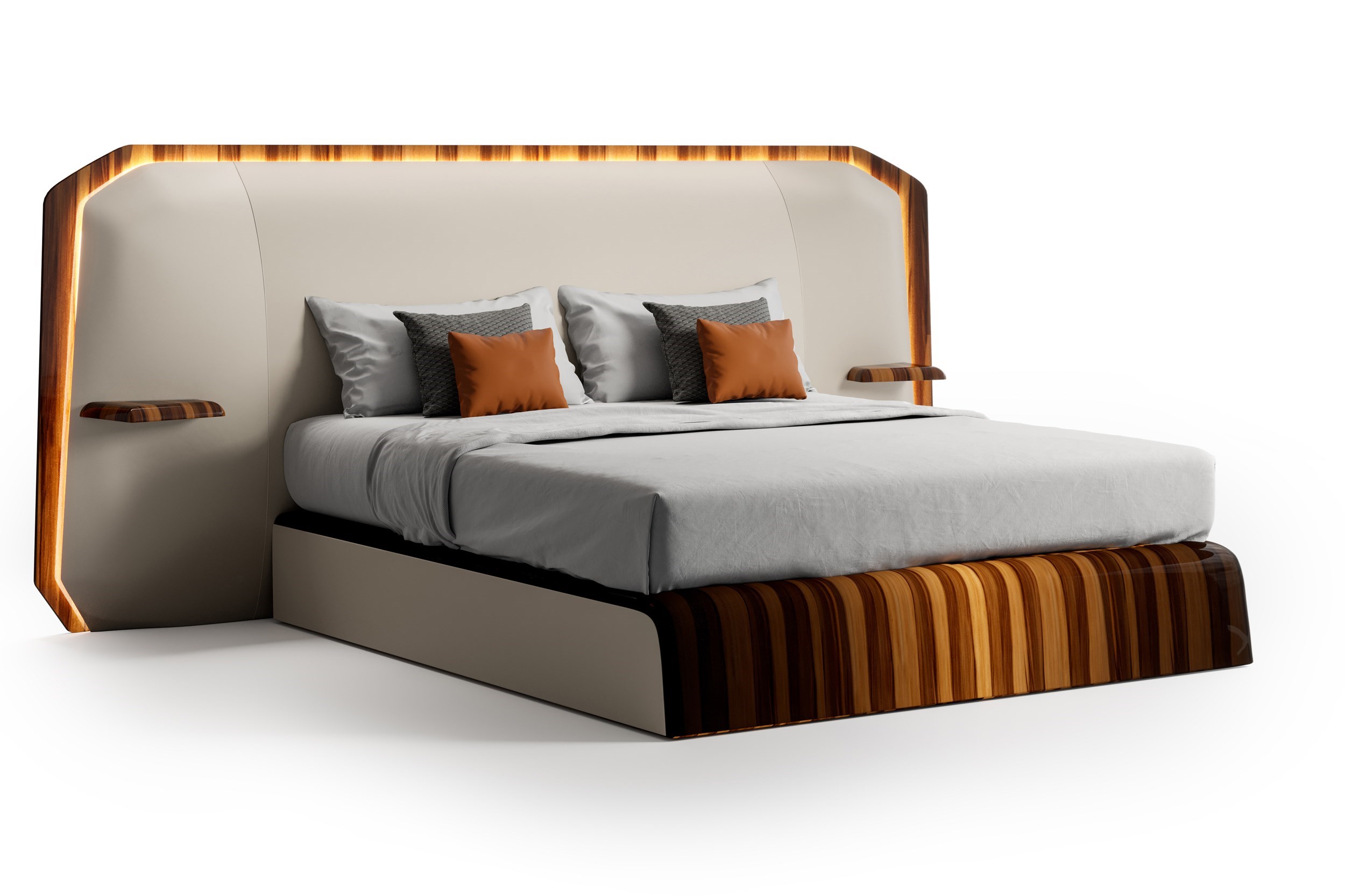 Sus líneas curvas y dinámicas definen esta cama de enorme confort, donde se fusionan minimalismo y elegancia. La estructura interior del doble cabecero está disponible con un acabado barnizado o de madera natural, y contrasta con la fina tapicería para simular la sensación de movimiento. Se puede integrar una luz opcional en el cabecero que realza las diferentes texturas de la cama con un resultado tanto estético como funcional. Tanto la estructura interna como los estantes de los laterales de la cama y el pie están disponibles con diferentes enchapados.