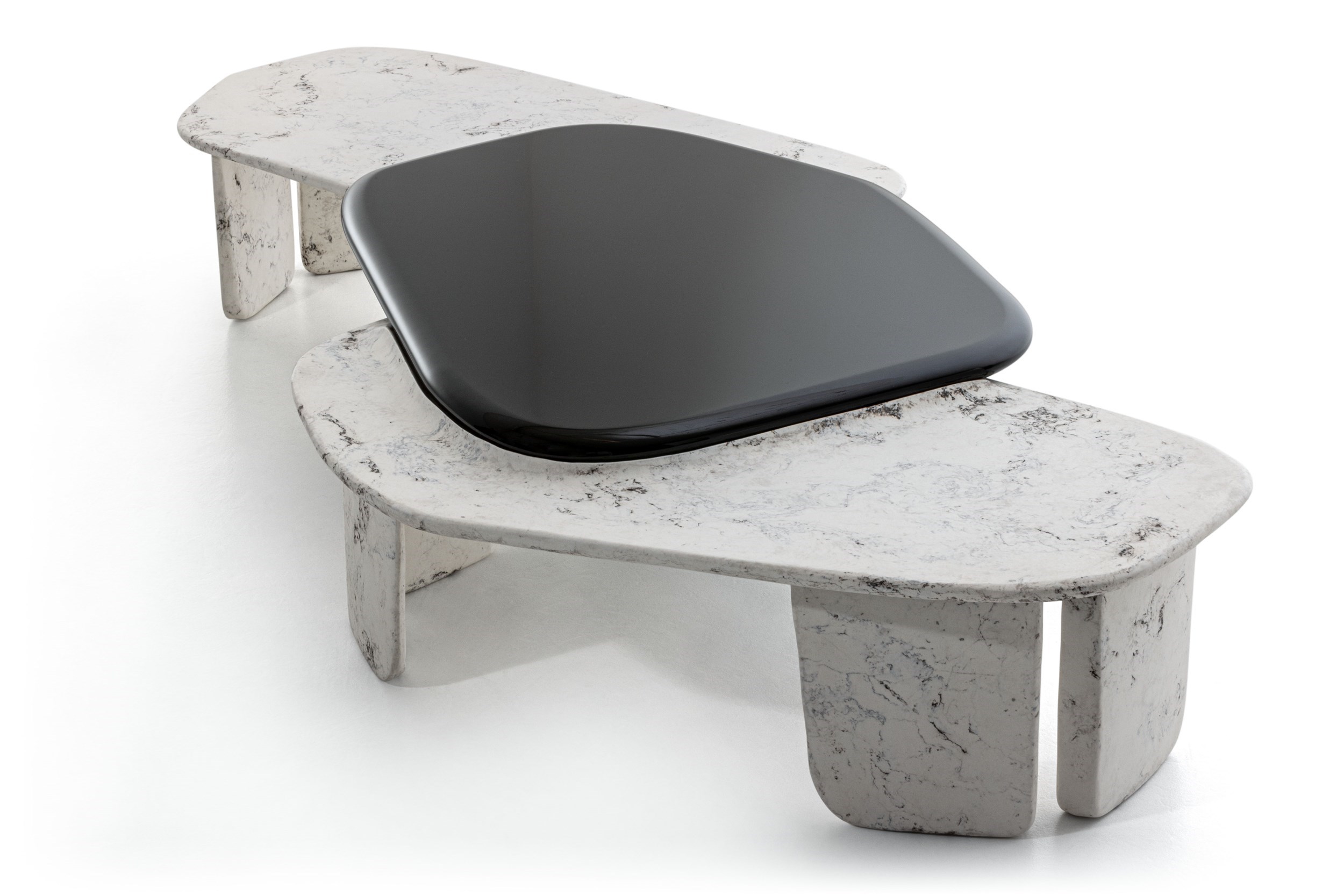 Una de las mesas bajas está disponible en versión Paper Factor®, diseñada por Riccardo Cavaciocchi. Se trata de una pieza elaborada con un compuesto de microcelulosa, es decir, «papel en bruto», con pigmentos naturales. Este material se procesa para obtener un tablero que se asemeja al mármol y que está disponible con un acabado monocromático o con toques en burdeos.