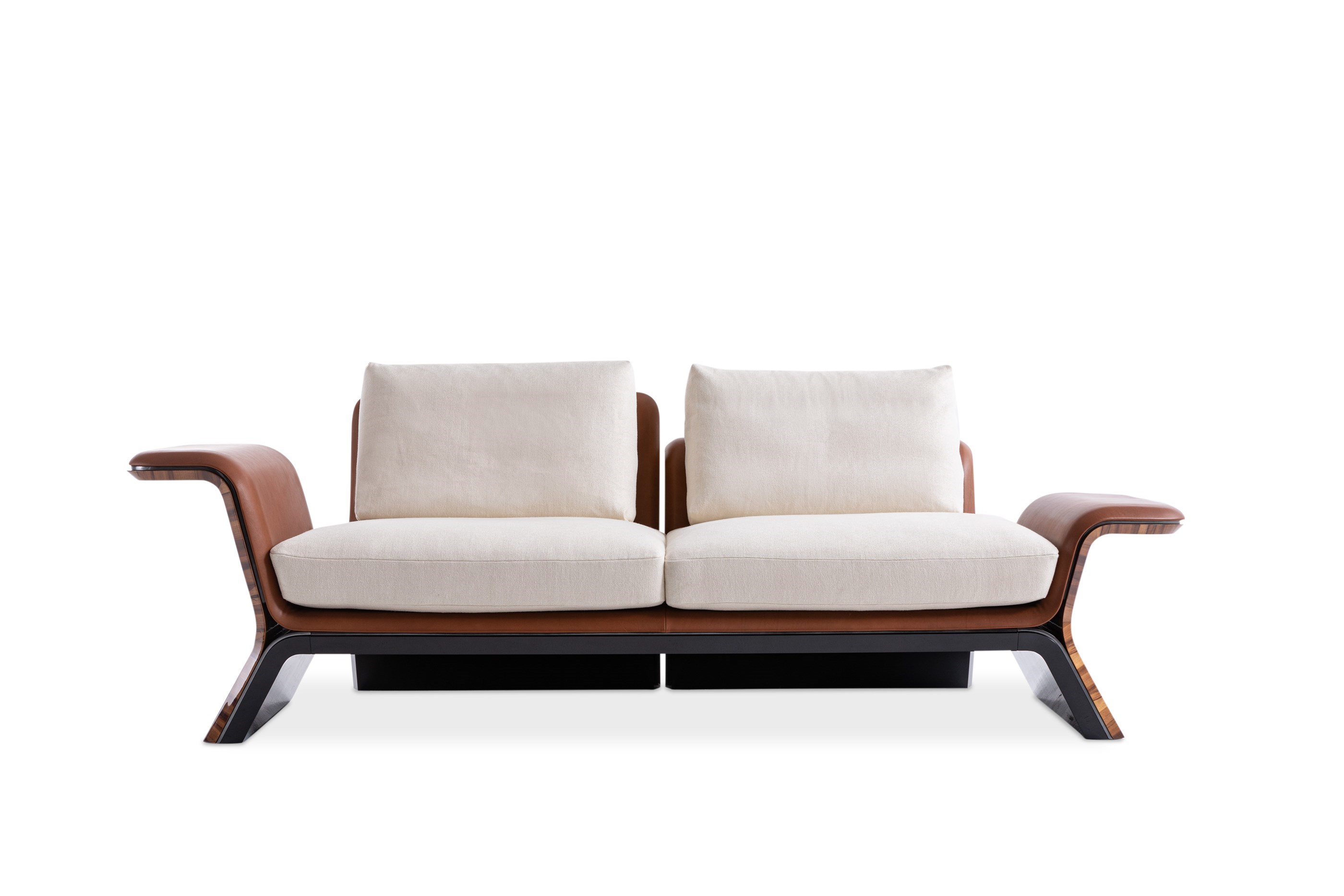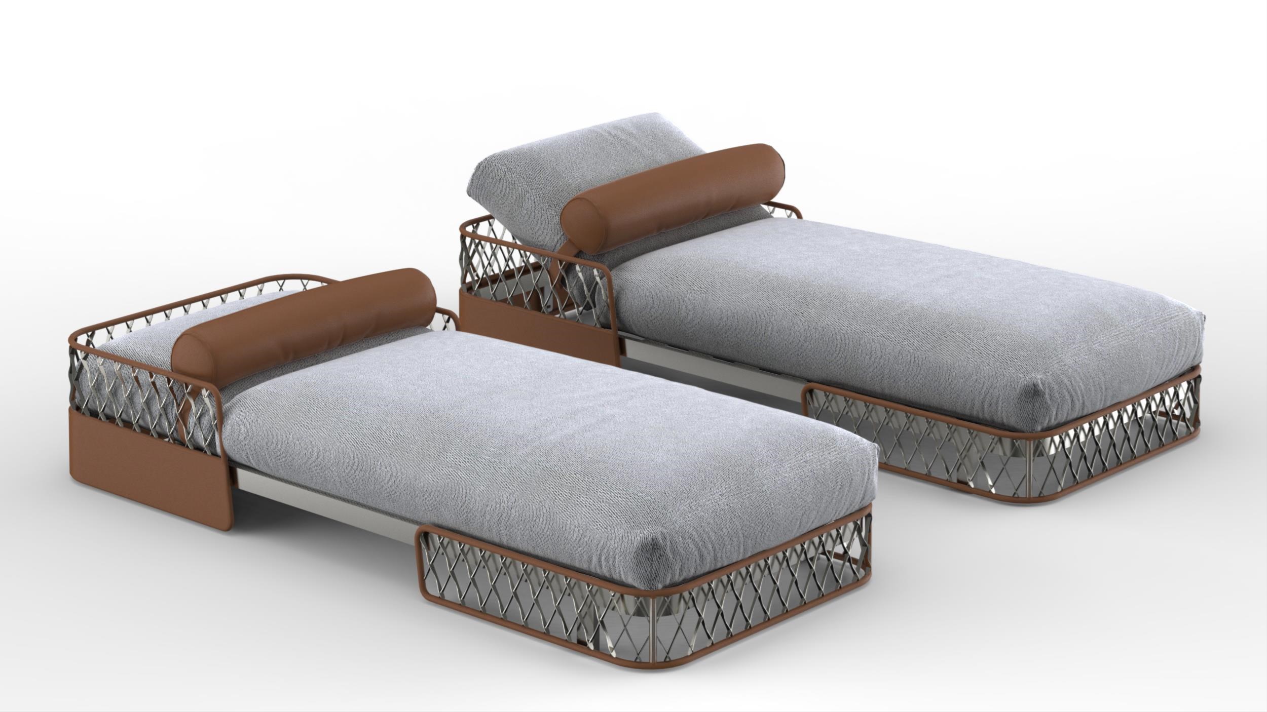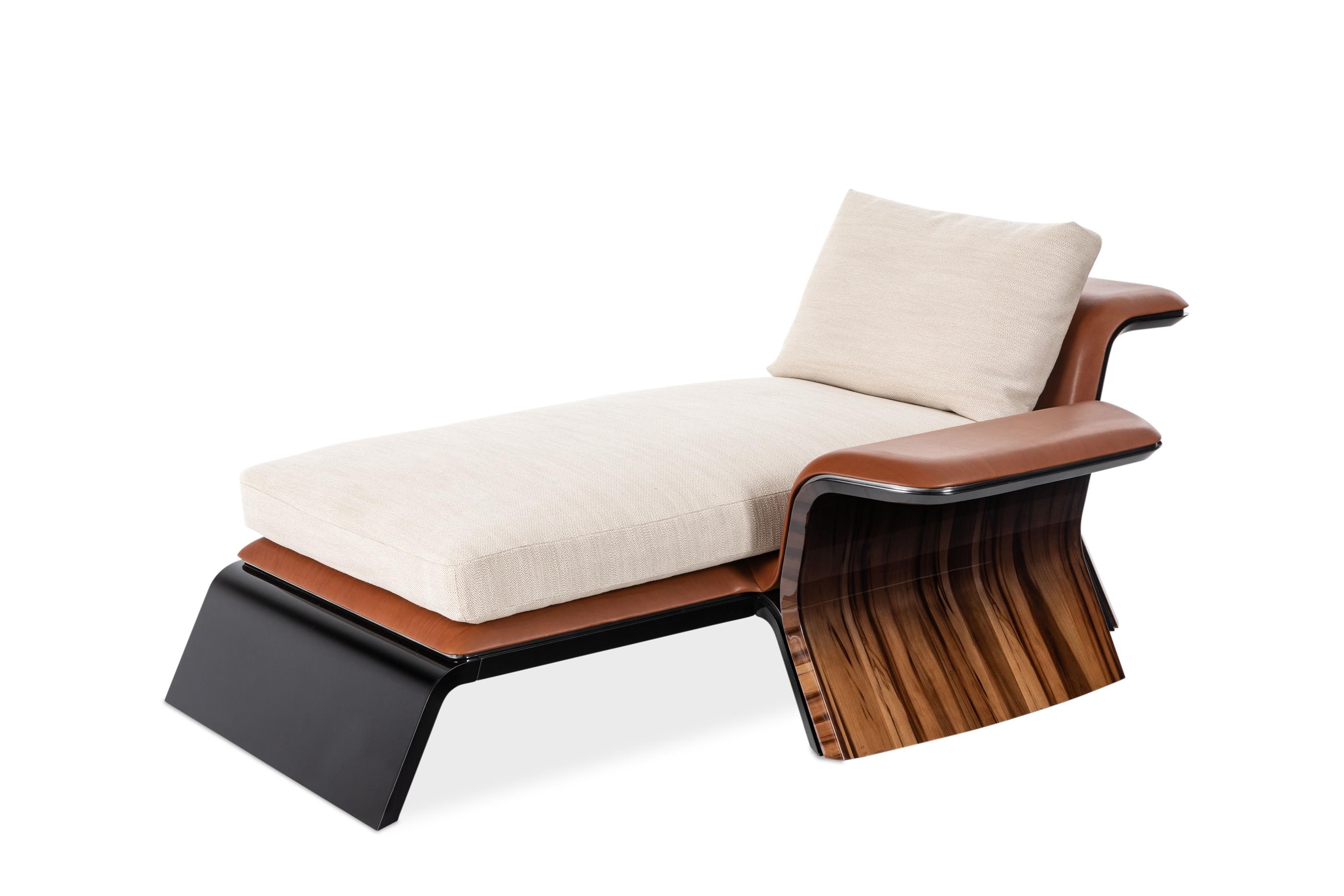 The Galloway Sofa, Bench and Chaise Longue are named after the landscape that overlooks the Irish Sea: a wild sanctuary of thick forest, peaceful hills, and mountains. Power and fluidity combine in a curving motion, from the legs to the armrests. These pieces can be customised by combining a high or low armrest and backrest. Its frame is made up of three layers of wood veneers, reflective of those found in Bentley’s interior car cabins: Warm Grey Fiddleback Sycamore, Smoked Liquidambar or Burr Walnut Briarroot; with either glossy, brushed finishing, Degrade Lacquer or Metal Lacquer effect. Soft leather upholstery is juxtaposed by the Gun-Metal Grey profile of the furniture pieces. The Galloway silhouettes play with folds and tapering thicknesses, with a light yet bold structure taking shape from the voluminous base of each piece. Armrests are rounded like a bow and defined by their elegant curvature.