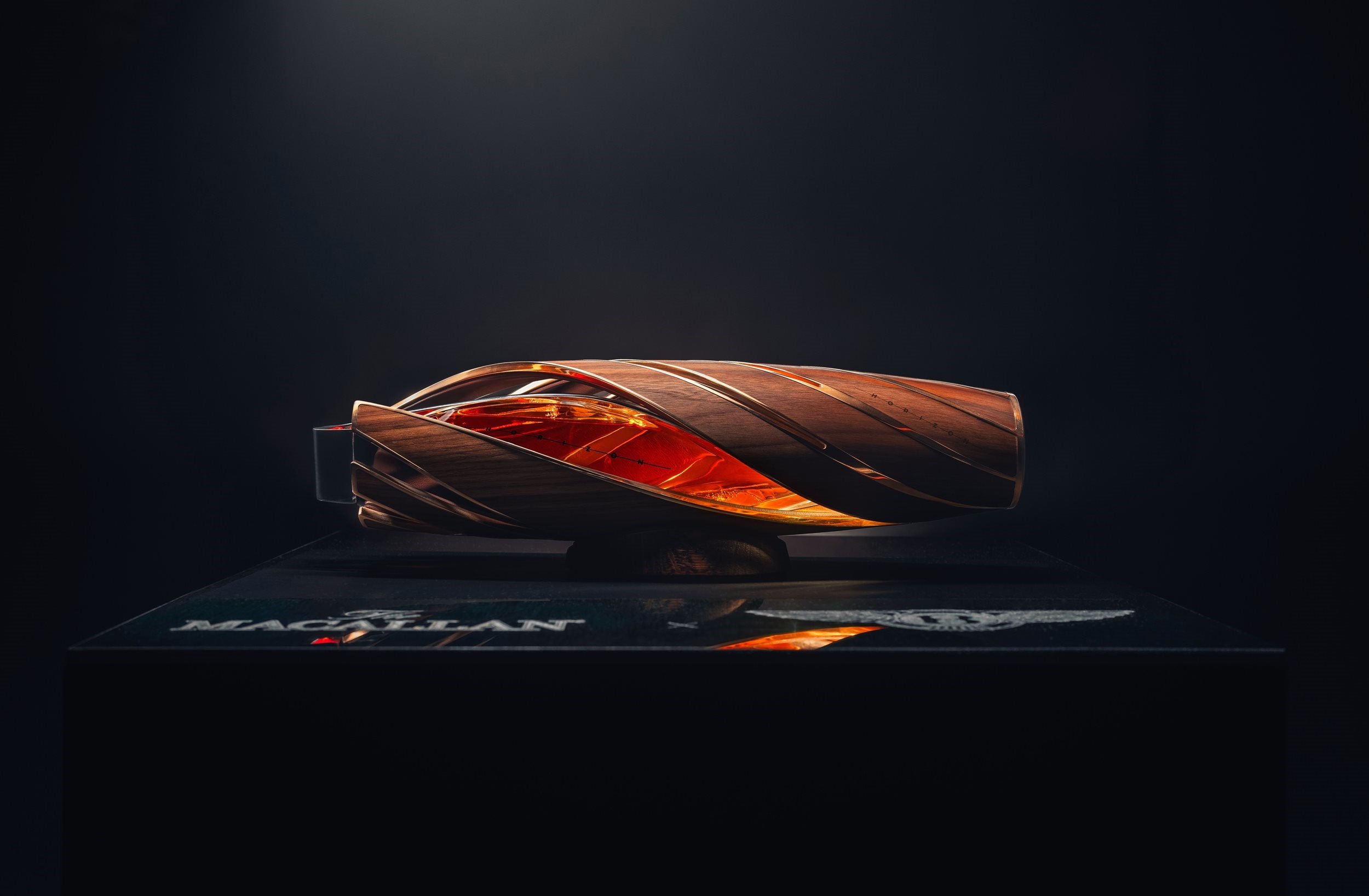 The prototype vessel that has been jointly crafted is unlike any bottle of whisky in history. The unique design defies the traditional vertical aesthetic of a whisky bottle and reflects the horizontal trajectory of a car, pushing the boundaries and the art of the possible. Accordingly, the vessel sits horizontally in a purpose-build cradle, and has no standing base.